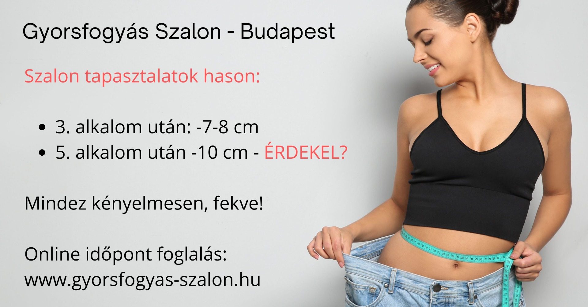 Szalon tapasztalataink: fekve, kényelmesen, 3. kezelés után 7-8 cm, 5. kezelés után minusz 10 cm a hason. Érdekel hogyan?